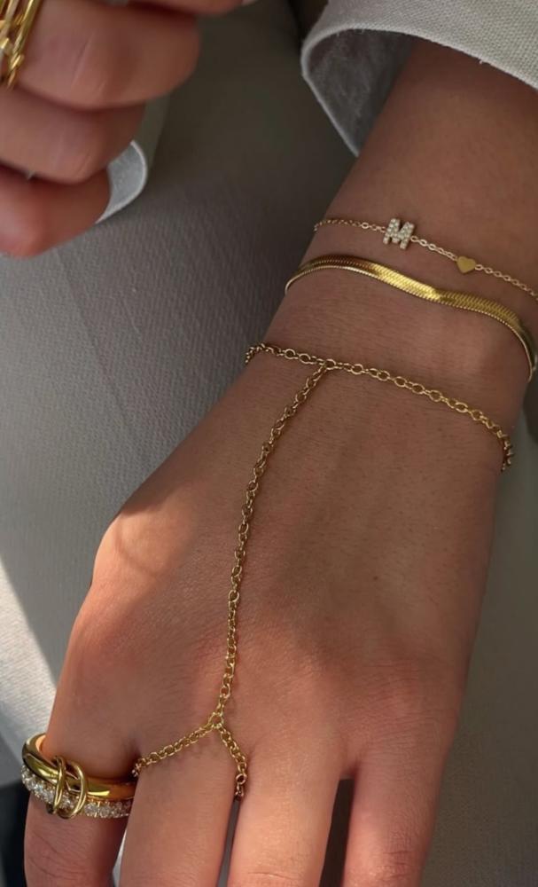 اسورة متصلة مع خاتم سادة لونها ذهبي نحاسيمصنوعة من فولاذ المقاوم للصدأ مقاس الكف واحد يناسب من مقاس 15 إلى 23 سمخفيفة ومريحة مثالية للارتداء اليومييبرز جمال اليدين ويضيف لمسة فخمة لأي إطلالة